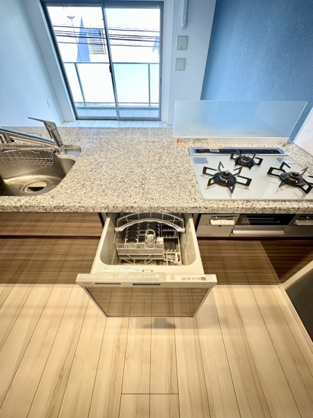 家事の時短に効果大の食洗器付き。高温でパワフルに洗い、温風乾燥します。手洗いよりも節水・節約が可能です。 一度使うと手放せないですよ!
