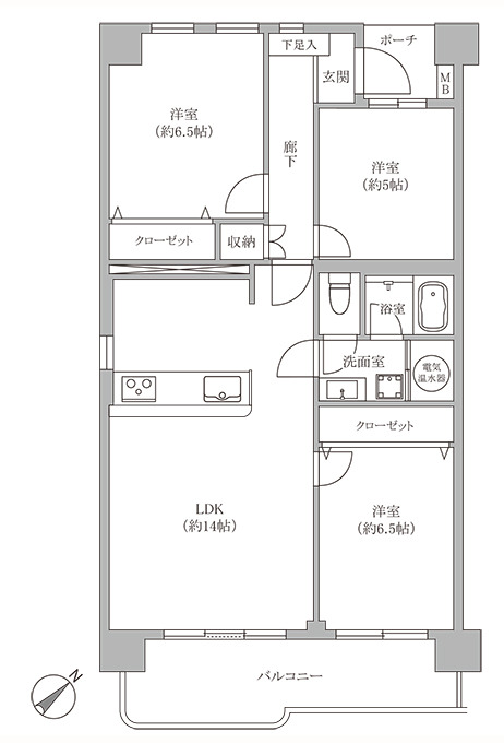 | 間取 | 3LDK (LDK14帖、洋室6.5帖、洋室6.5帖、洋室5.0帖) | ||