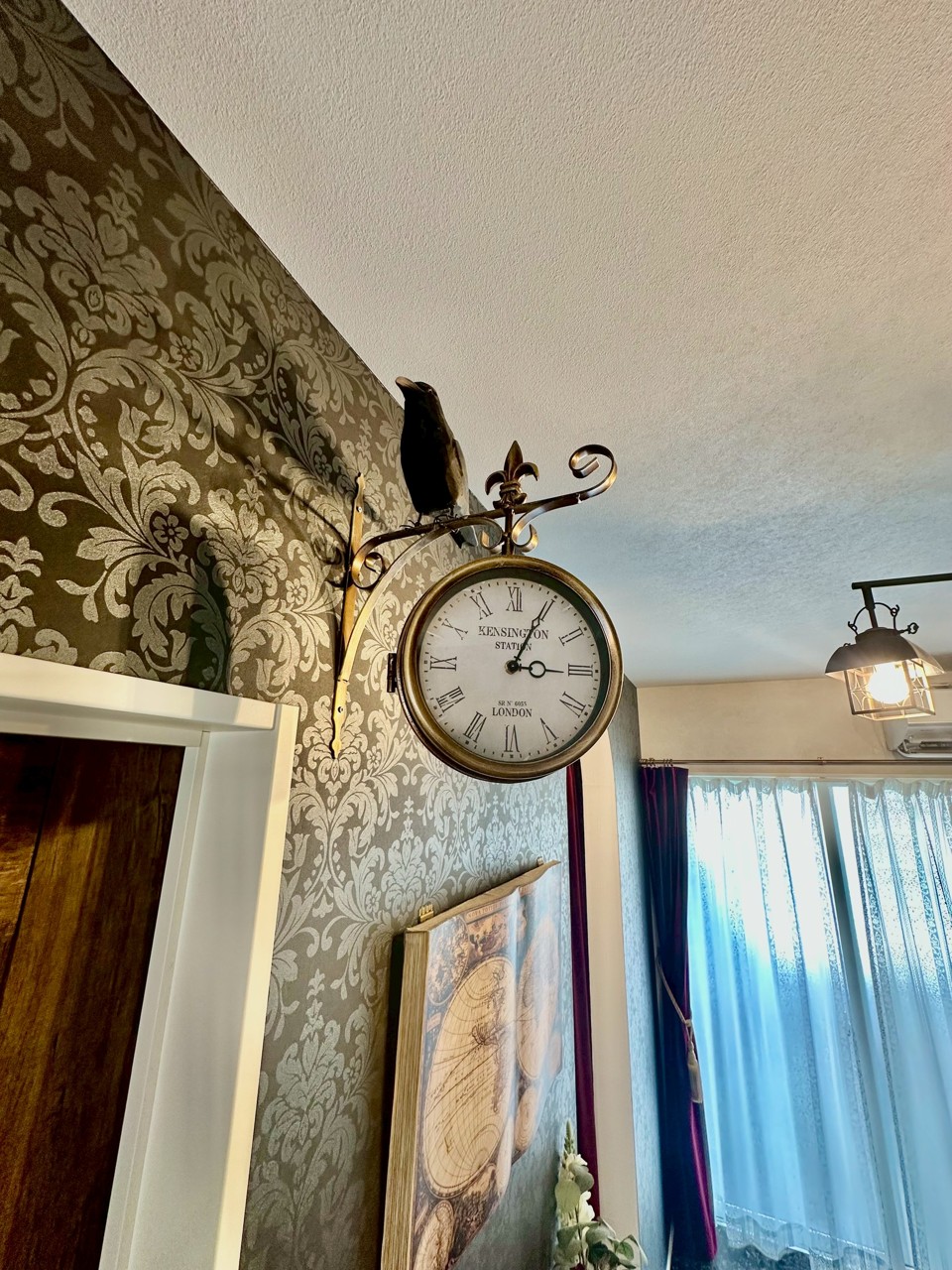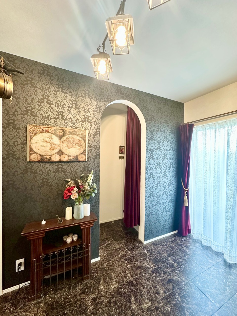 シックなダークトーンの壁紙には、上品なダマスク柄が施され、空間全体に深みと高級感を与えています。