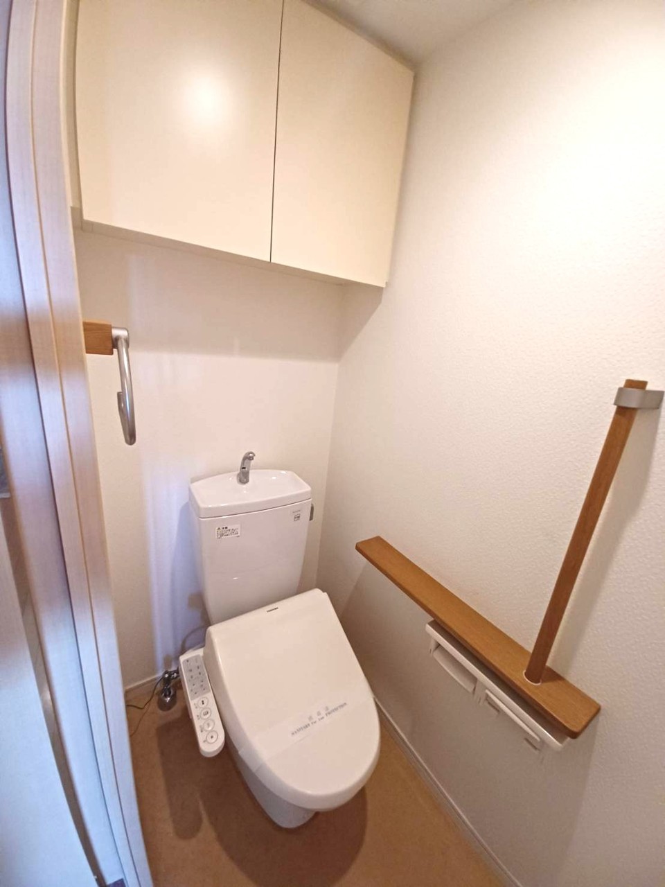 上部に収納棚があり、トイレットペーパーや掃除用具をスッキリ収納できます!