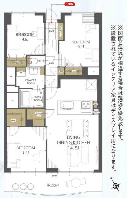 | 間取 | 3LDK + WIC+ファミリークローゼット (LDK14.5帖、洋室5.4帖、洋室4.6帖、洋室6.0帖) | ||