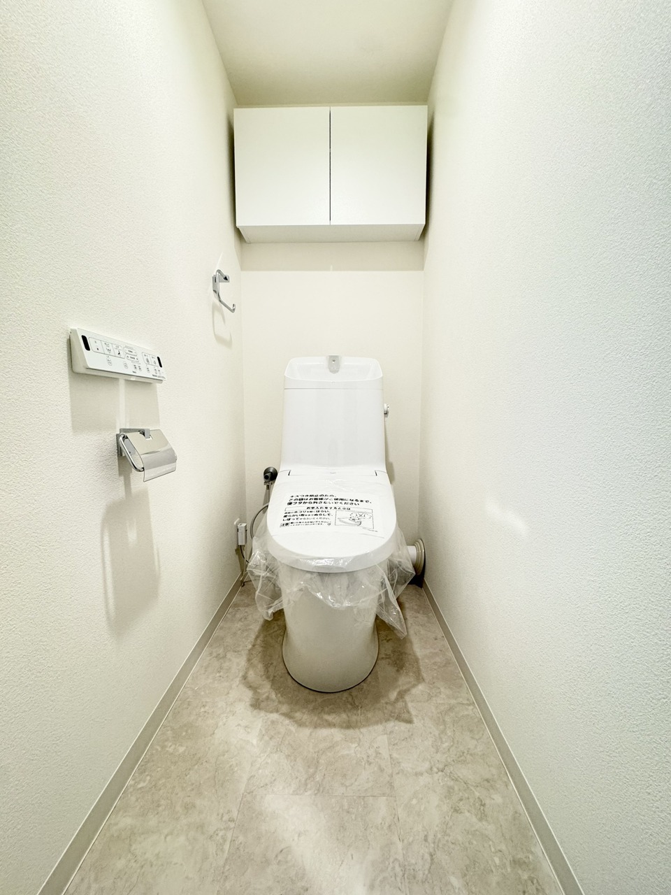 上部に収納棚があり、トイレットペーパーや掃除用具をスッキリ収納できます!