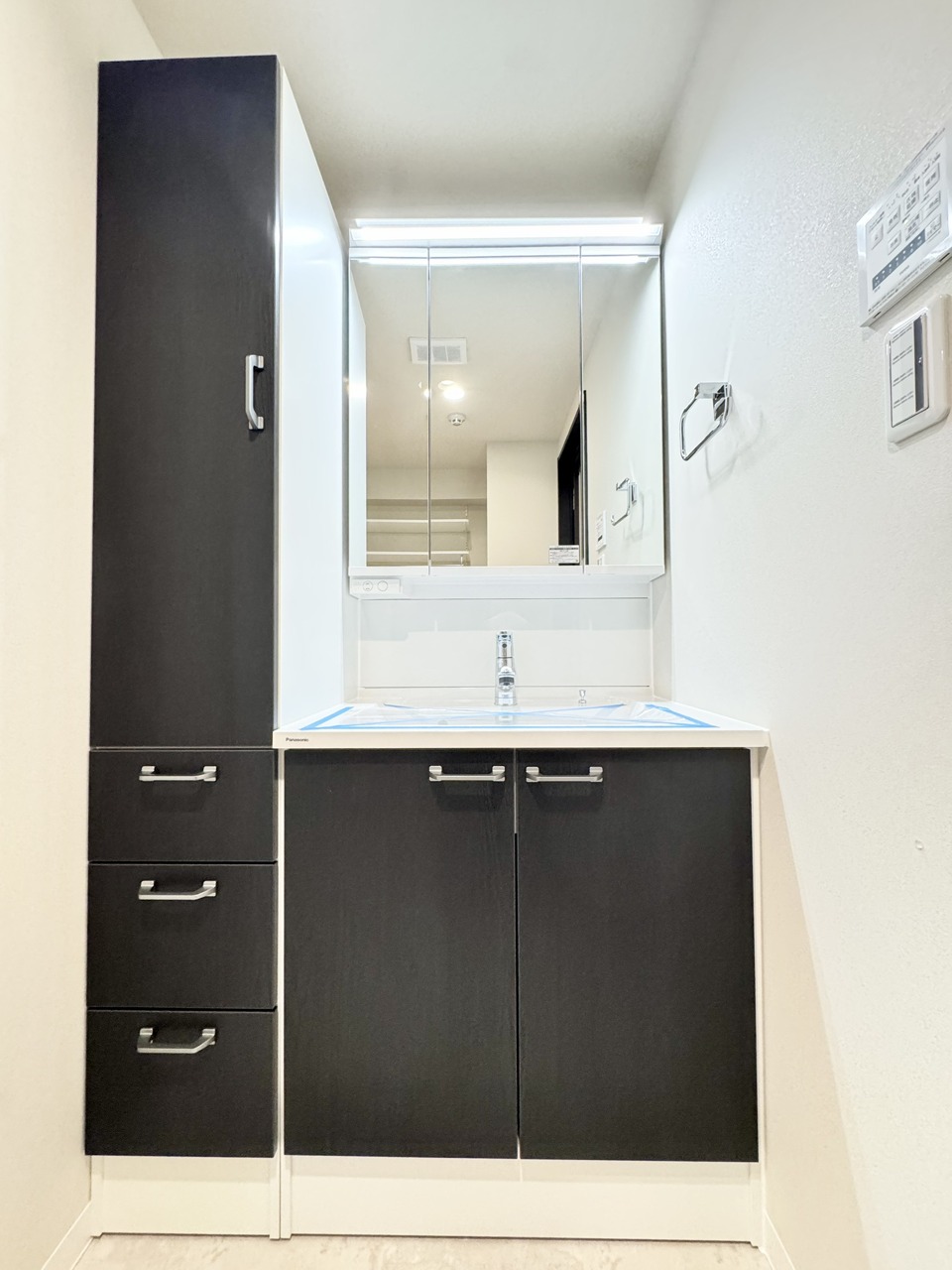 朝の身支度に便利なシャンプードレッサーはとっても便利です!シンク下の収納でアメニティ類のストックもバッチリ!