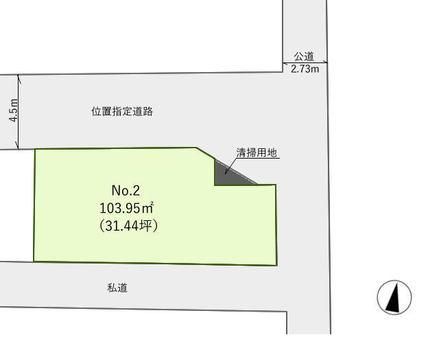 | 権利種類 | 所有権 | 接道 | 東側2.7M公道に接道 北側4.5M私道に接道 |