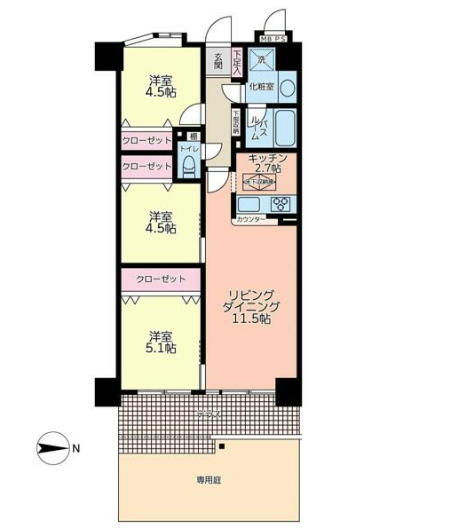 | 間取 | 3LDK (LDK14.2帖、洋室4.5帖、洋室4.5帖、洋室5.1帖) | ||
