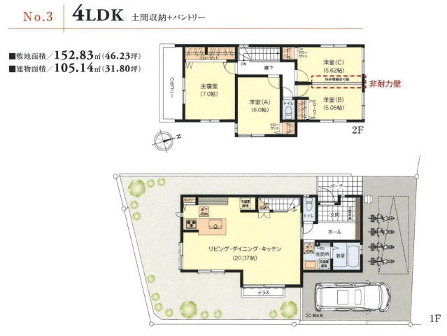 46坪以上の敷地で広々とした駐車スペースと南庭を確保した4LDK!