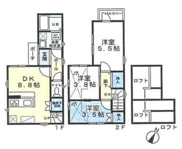 | 間取 | 3DK + ロフト (DK8.8帖、洋室3.8帖、洋室5.5帖、洋室3.5帖) | ||