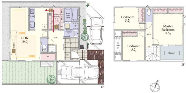 | 間取 | 3LDK + ファミリークローゼット (LDK16帖、洋室5.2帖、洋室5.2帖、洋室8.5帖) | ||