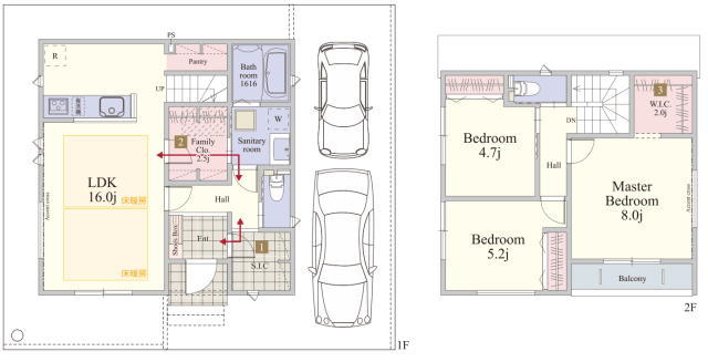| 間取 | 3LDK + WIC+パントリー (LDK16帖、洋室4.7帖、洋室5.2帖、洋室8.0帖) | ||