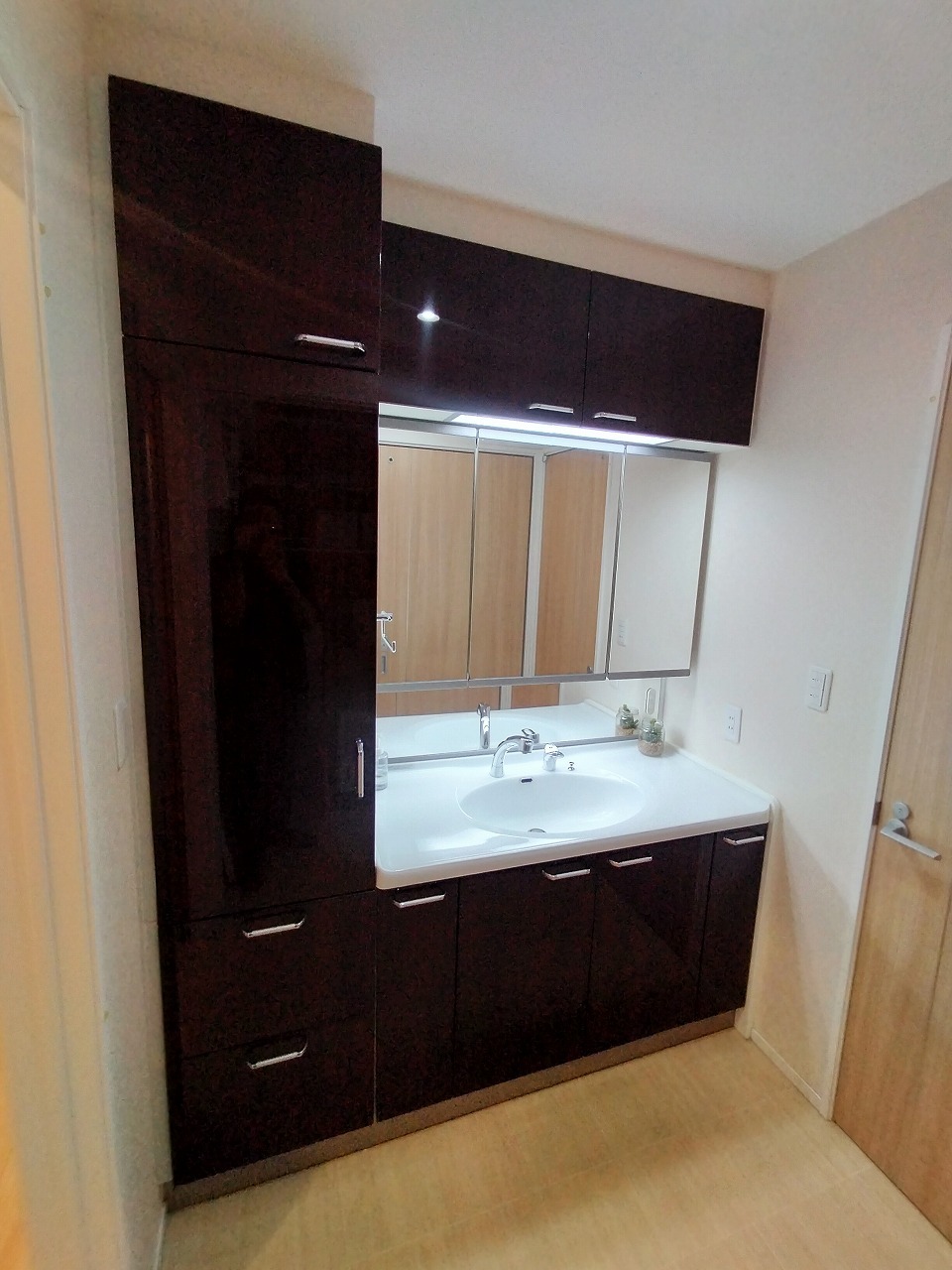 洗面化粧台の横にはリネン棚も設置してありますので、バスタオルや洗剤等のストックも大変便利です。