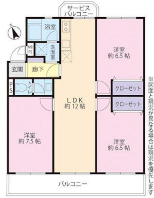 | 間取 | 3LDK (LDK12帖、洋室6.5帖、洋室6.5帖、洋室7.5帖) | ||