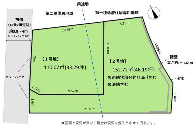 | 用途地域 | 第二種住居地域/第一種低層住居専用地域 | 建ぺい率 | 60%/40% |