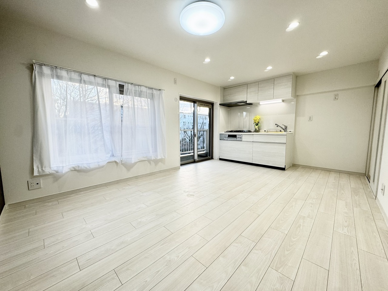 リビングと洋室1部屋が南向きのバルコニーに面しているため室内とても明るいですよ。全洋室にクローゼット、廊下に物入があり収納スペースもたっぷりあります。柱型のないアウトフレーム工法で室内広く使えます。リノベーション物件ですので、お引渡し後すぐに新生活がスタート出来ます!