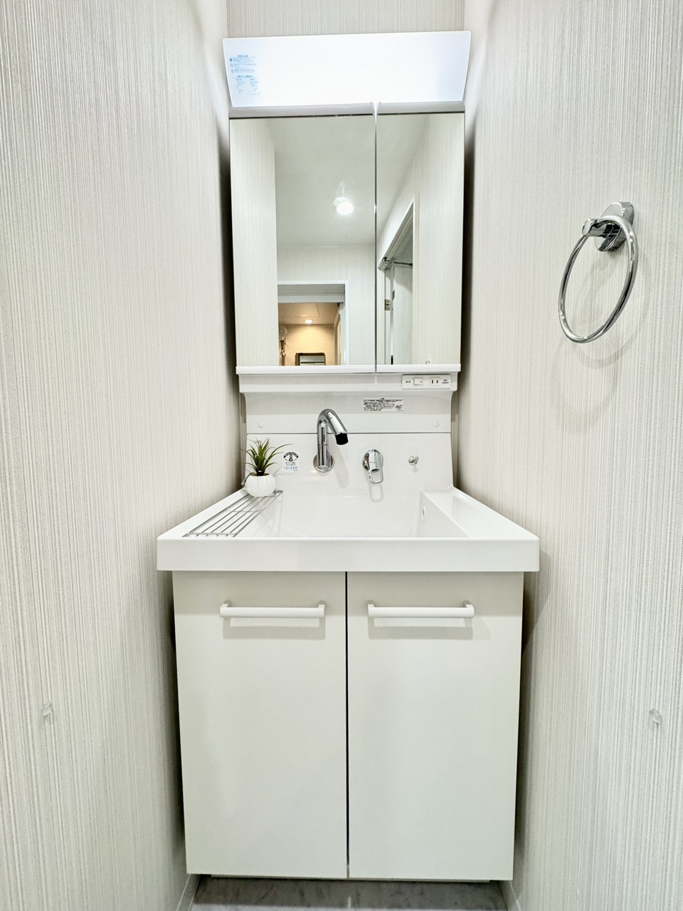 朝の身支度に便利なシャンプードレッサーはとっても便利です!シンク下の収納でアメニティ類のストックもバッチリ!