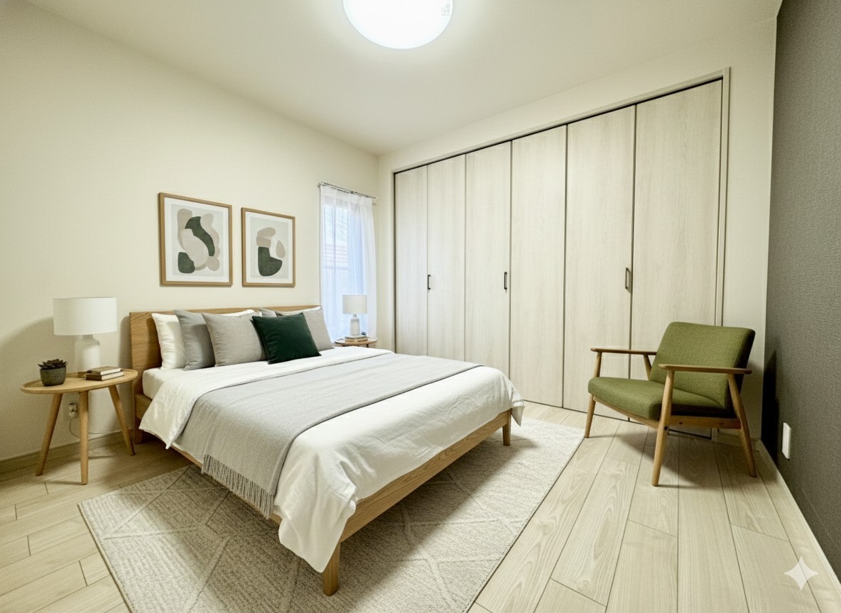 大容量の収納がある寝室。広々としたスペースでご家族の主寝室として、趣味のスペースなど多目的な用途に使用することができます! ※家具はイメージです。