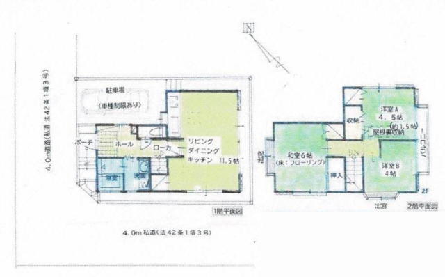 | 権利種類 | 所有権 | 接道 | 北側4M私道に7.6M接道 西側4M私道に8.1M接道 |