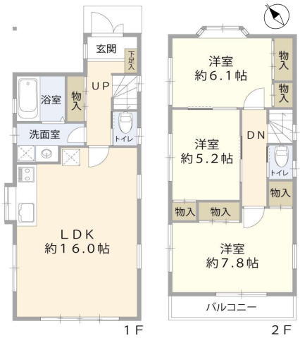 | 間取 | 3LDK (LDK16帖、洋室6.1帖、洋室5.2帖、洋室7.8帖) | ||