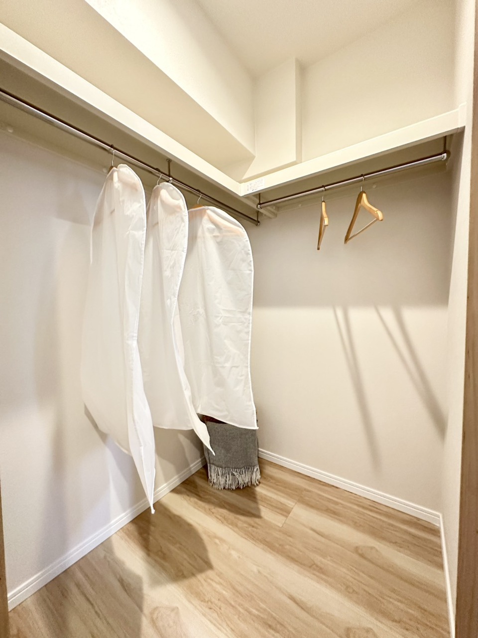 広々としたウォークインクローゼット! ゴルフバックや趣味の物など、まとめて収納できるのでお部屋を有効に使えますね! たくさんのお洋服やバッグを見やすく・取り出しやすく、慌ただしい朝もコーディネートを決めやすくなります。スーツケース等の大きな荷物の保管にも便利です。