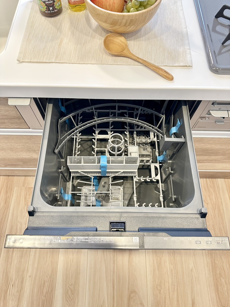 家事の時短に効果大の食洗器付き。高温でパワフルに洗い、温風乾燥します。手洗いよりも節水・節約が可能です。 一度使うと手放せないですよ!