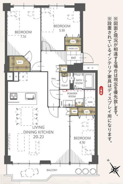 | 間取 | 3LDK + WIC (洋室7.5帖、洋室5.9帖、洋室4.9帖、LDK20.2帖) | ||