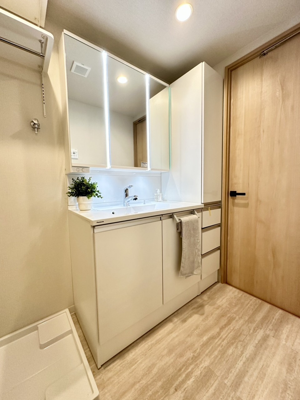 朝の身支度に便利なシャンプードレッサーはとっても便利です!シンク下の収納でアメニティ類のストックもバッチリ!