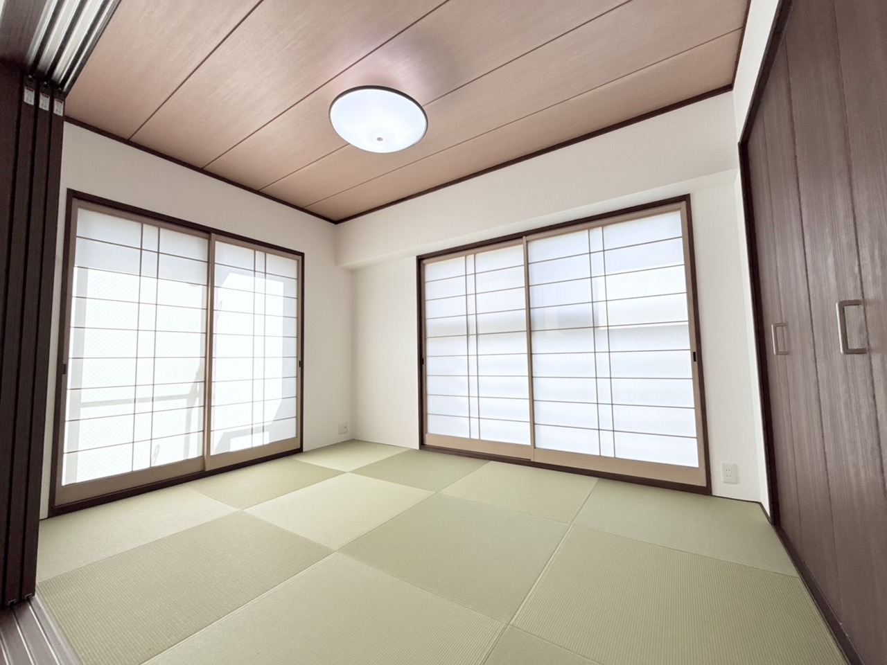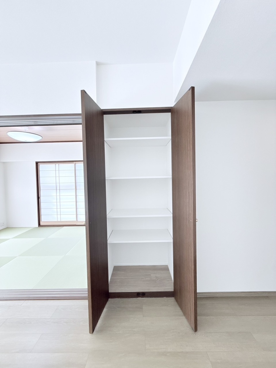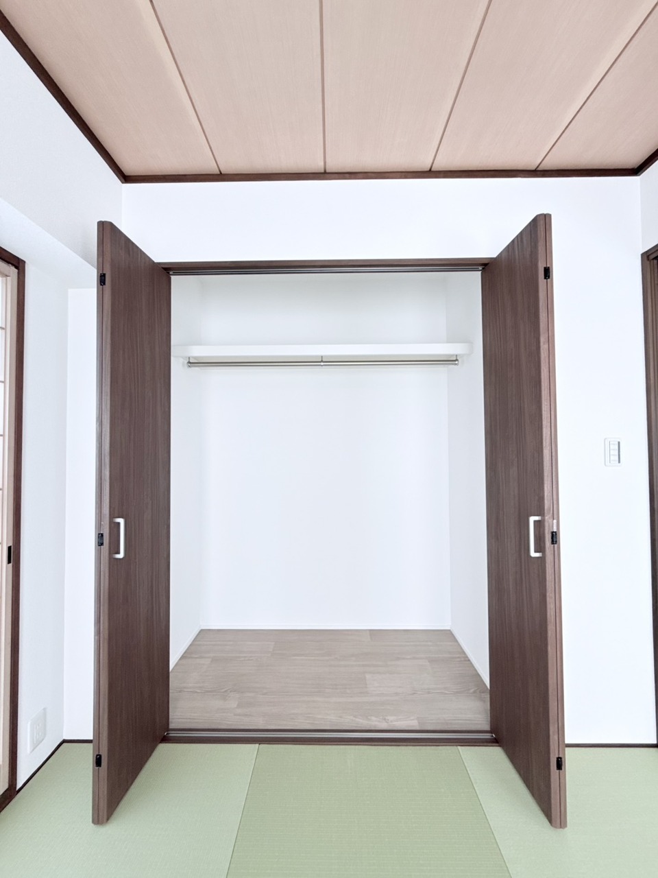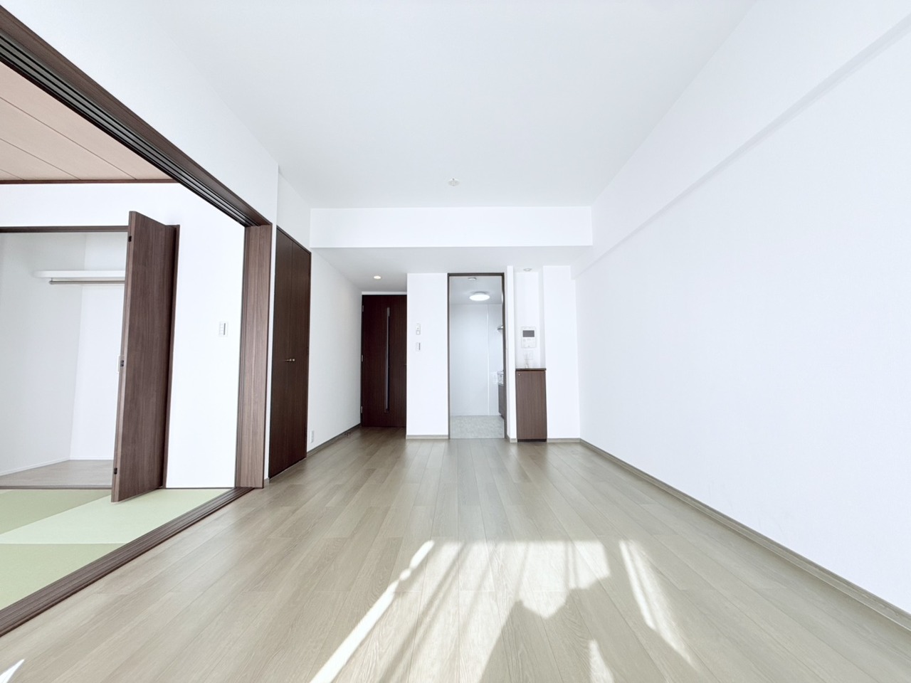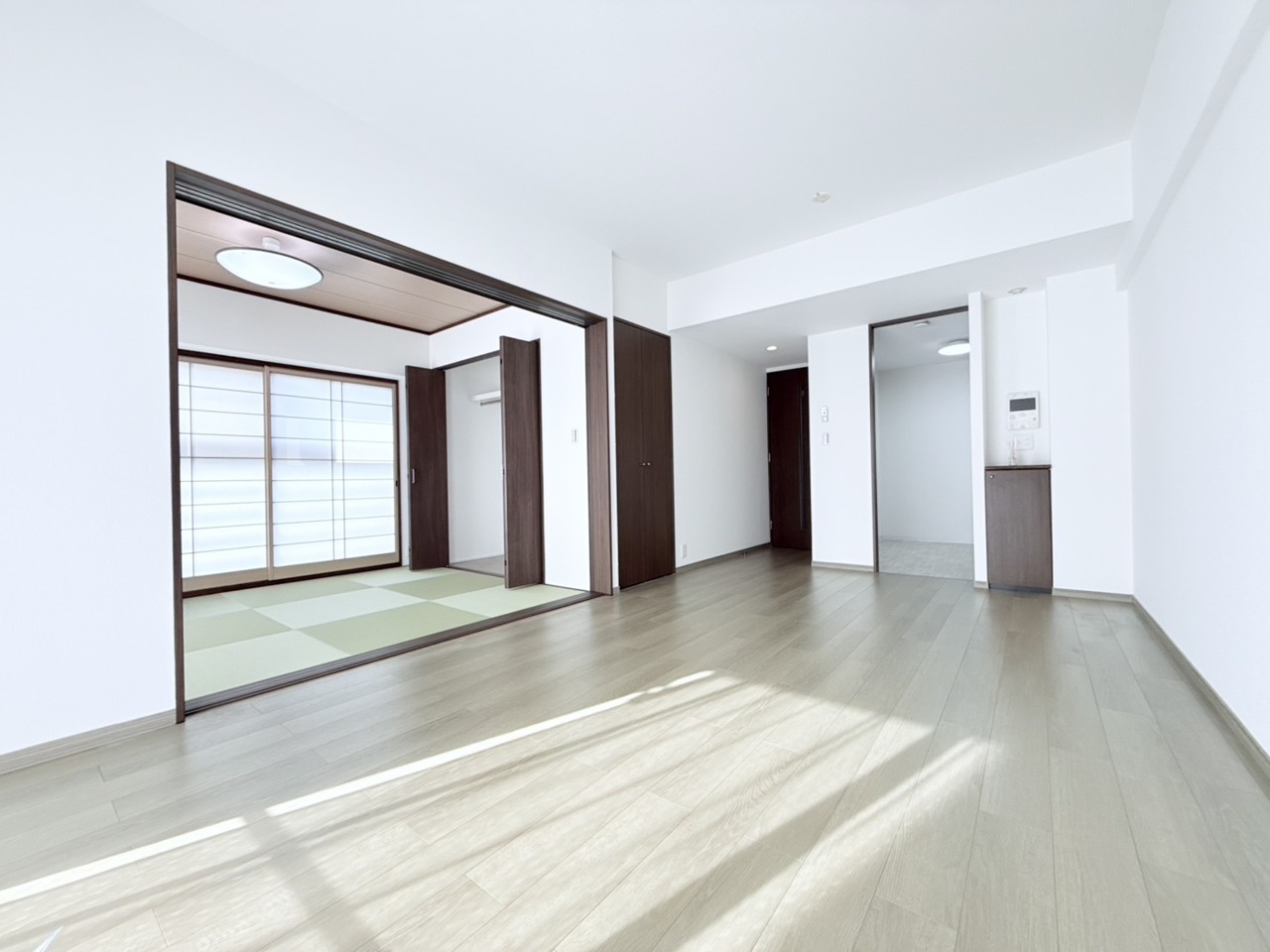 リビング横に設けられた和室スペース。 戸を開放してリビングと一体でお使い頂くと、とっても広く開放的になります! 真新しい畳の良い匂いがしますよっ!
