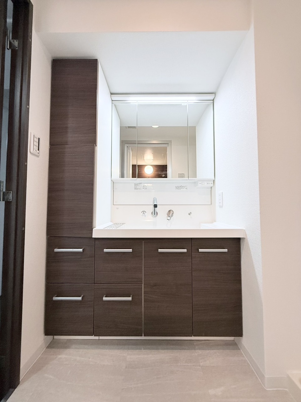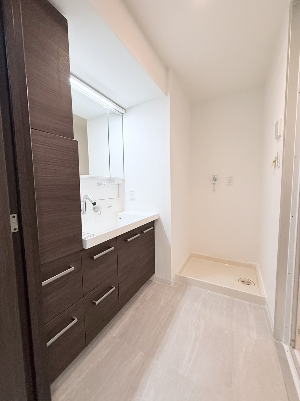 ゆとりの洗面スペースで朝の身支度も快適スムーズに。三面鏡で髪のセットやお化粧もストレスなくこなせ、朝から気分上昇! 三面鏡の背面とシンク下の収納もたっぷり!アメニティ類のストックもバッチリ!