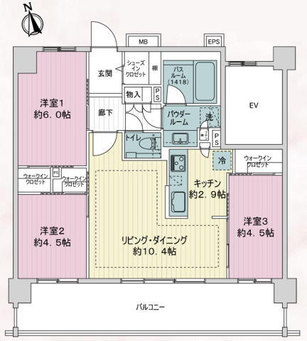| 間取 | 3LDK + 3WIC+SIC (LDK13.3帖、洋室6.0帖、洋室4.5帖、洋室4.5帖) | ||