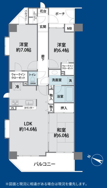 | 間取 | 3LDK + 2WIC (洋室7帖、洋室6.4帖、和室6帖、LDK14.6帖) | ||