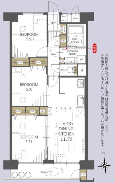 | 間取 | 3LDK (洋室5.7帖、洋室5.5帖、洋室5帖、LDK11.7帖) | ||
