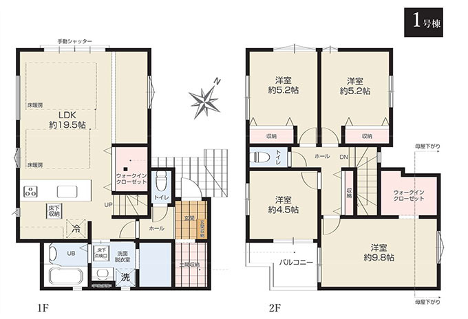 | 間取 | 4LDK + 土間収納、2WIC、リネン庫 (LDK19.5帖、洋室5.2帖、洋室5.2帖、洋室4.5帖、洋室9.8帖) | ||