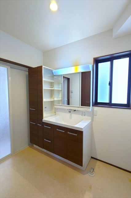 洗面化粧台の横にはリネン棚も設置してあります!バスタオルや洗剤、柔軟剤、シャンプー、ボディソープのストックに!ありがたい収納スペースです。