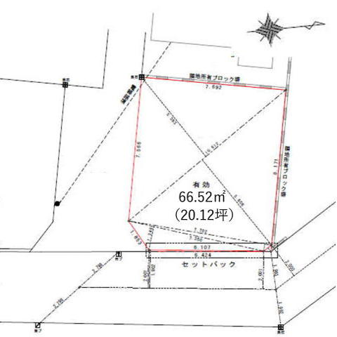| 土地面積 | 66.99m² 公簿 (私道47m²別に有、私道持分比率:1/5、セットバック0.47m²) | ||