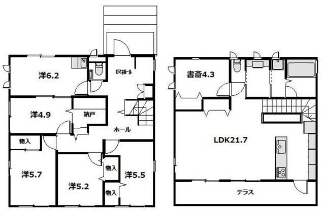 | 間取 | 5SLDK + 納戸 (LDK21.7帖、洋室6.2帖、洋室4.9帖、洋室5.7帖、洋室5.2帖、洋室5.5帖、S4.3帖) | ||