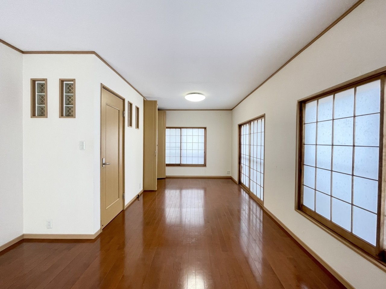 リビング横に設けられた和室スペース。 戸を開放してリビングと一体でお使い頂くと、とっても広く開放的になります! 真新しい畳の良い匂いがしますよっ!