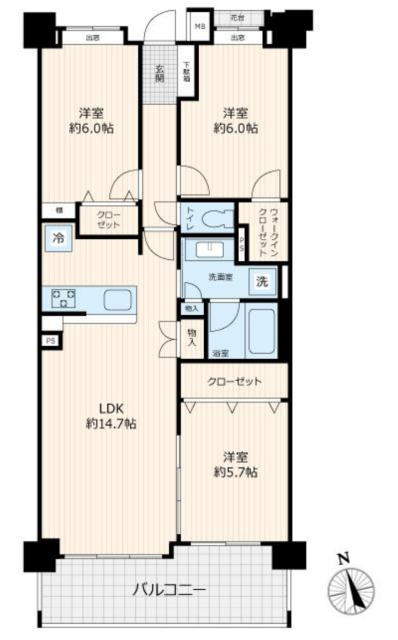 | 間取 | 3LDK + WIC (LDK14.7帖、洋室5.7帖、洋室6帖、洋室6帖) | ||