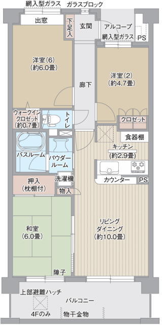 | 間取 | 3LDK + WIC (洋室6帖、洋室4.7帖、LDK12.9帖、和室6帖) | ||