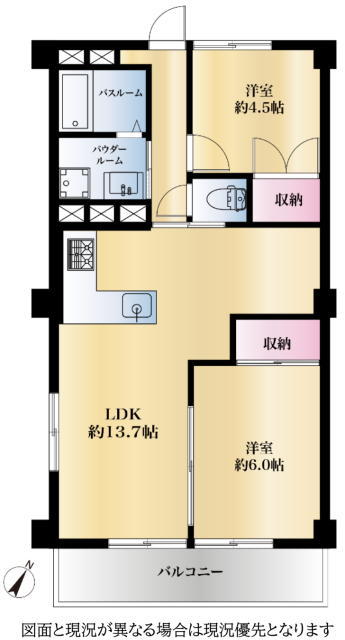 | 間取 | 2LDK (LDK13.7帖、洋室4.5帖、洋室6.0帖) | ||