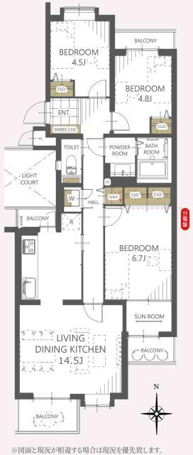 | 間取 | 3LDK (洋室6.7帖、洋室4.8帖、洋室4.5帖、LDK14.5帖) | ||