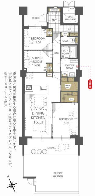 | 間取 | 2SLDK + WIC+FC (洋室6.9帖、洋室4.5帖、S4.5帖、LDK16.3帖) | ||