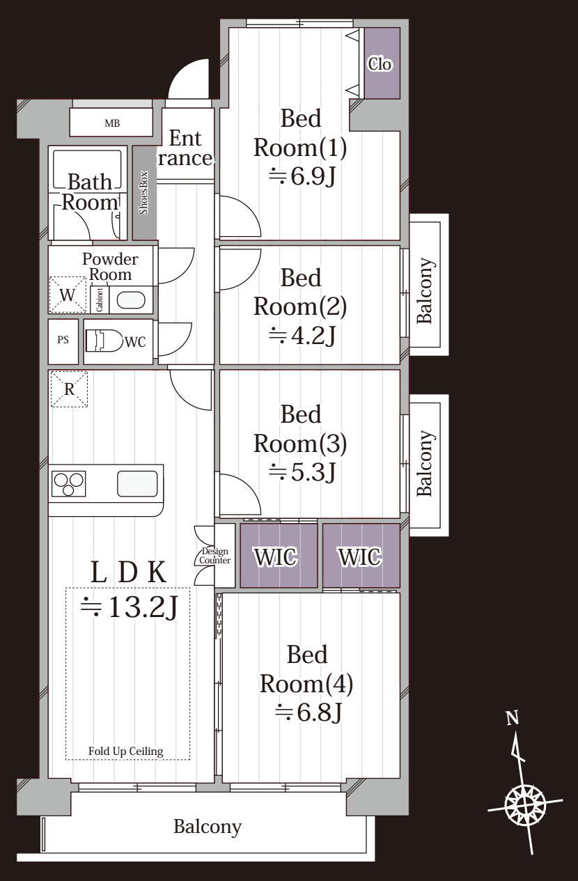 | 間取 | 4LDK + 2WIC (LDK13.2帖、洋室6.9帖、洋室4.2帖、洋室5.3帖、洋室6.8帖) | ||