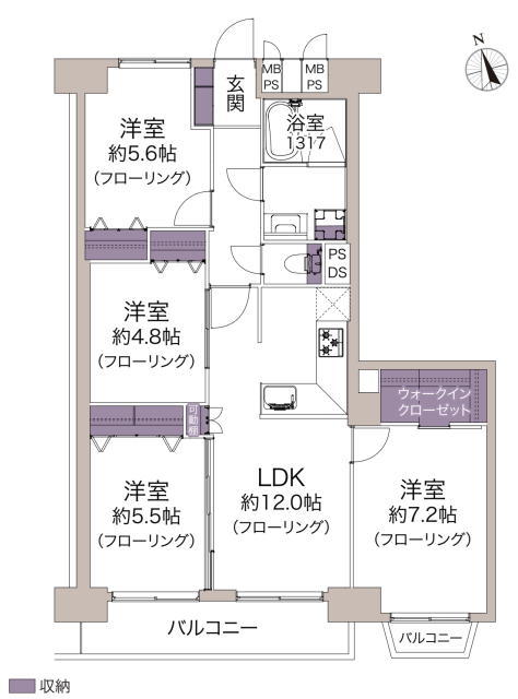 | 間取 | 4LDK + WIC (LDK12帖、洋室5.6帖、洋室4.8帖、洋室5.5帖、洋室7.2帖) | ||