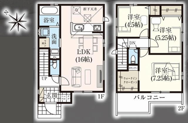 | 間取 | 3LDK + WIC (LDK16帖、洋室4.5帖、洋室5.25帖、洋室7.25帖) | ||