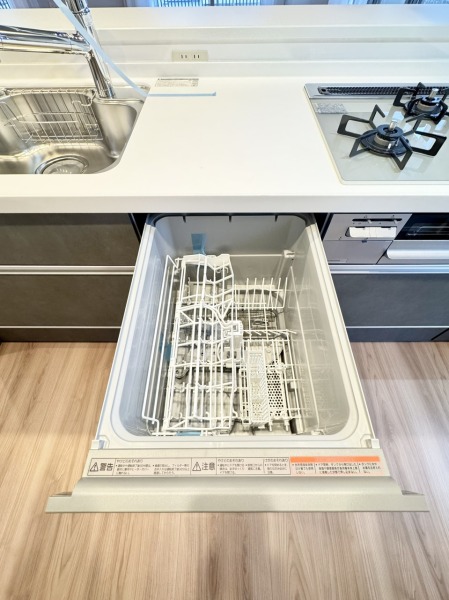 家事の時短に効果大の食洗器付き。高温でパワフルに洗い、温風乾燥します。手洗いよりも節水・節約が可能です。 一度使うと手放せないですよ!