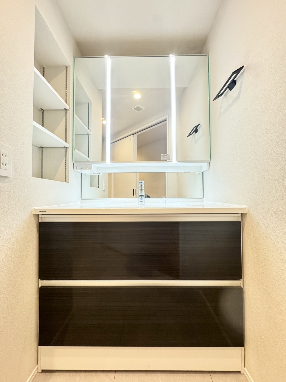朝の身支度に便利なシャンプードレッサーはとっても便利です!シンク下の収納でアメニティ類のストックもバッチリ!