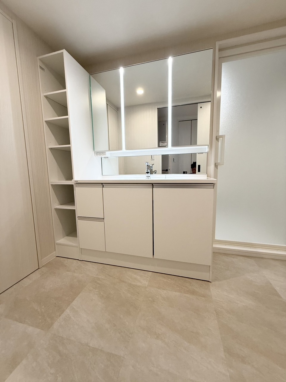 ゆとりの洗面スペースで朝の身支度も快適スムーズに。三面鏡で髪のセットやお化粧もストレスなくこなせ、朝から気分上昇! 三面鏡の背面とシンク下の収納もたっぷり!アメニティ類のストックもバッチリ!