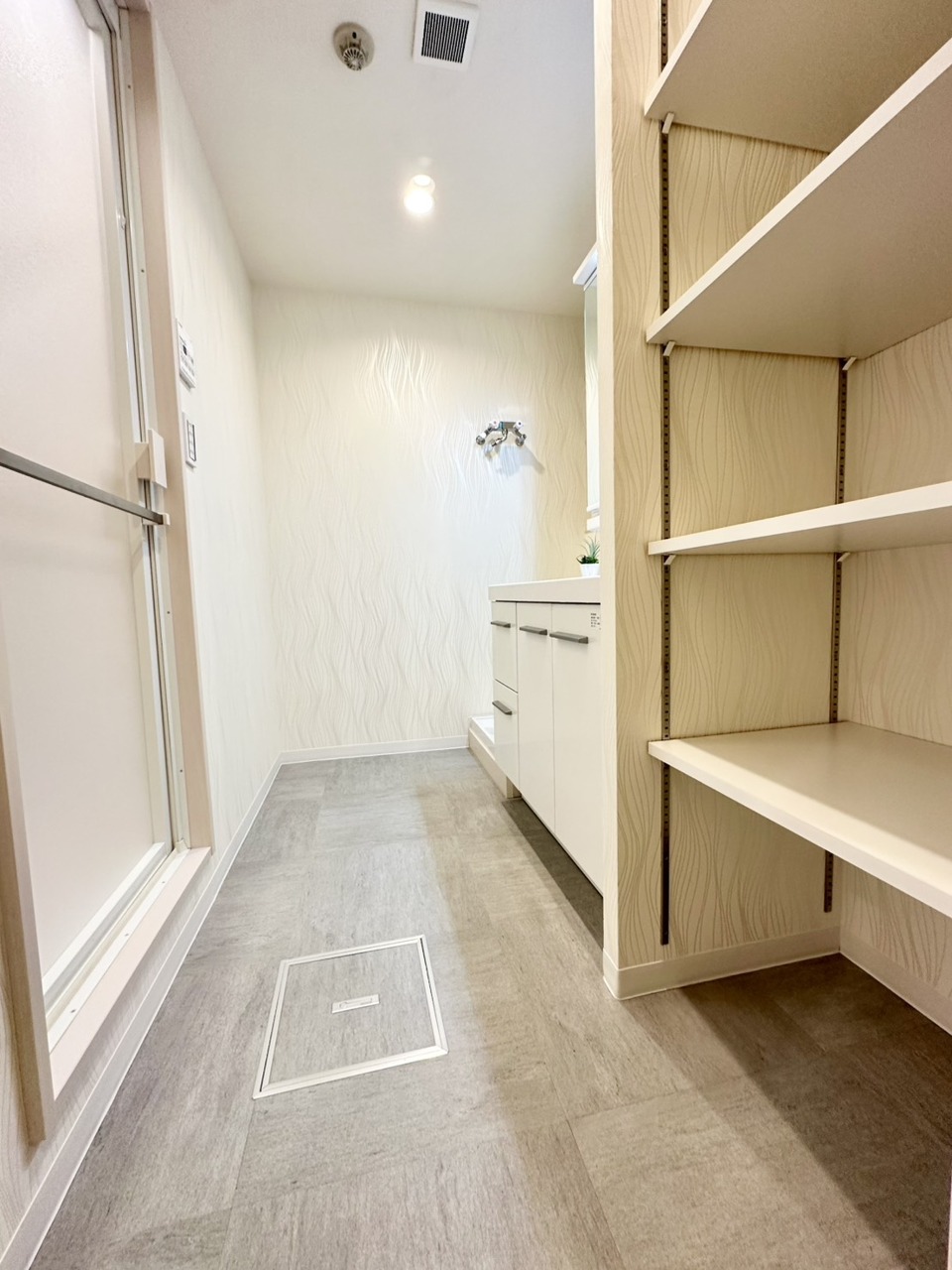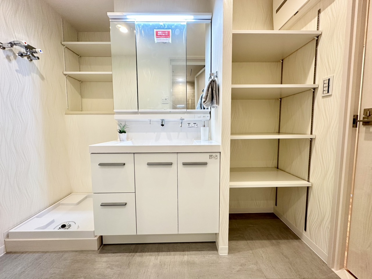 朝の身支度に便利なシャンプードレッサーはとっても便利です!シンク下の収納でアメニティ類のストックもバッチリ!