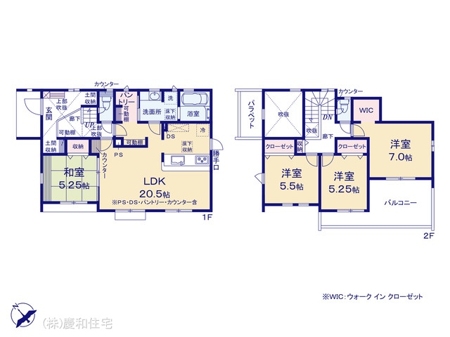 | 間取 | 4LDK + WIC+土間収納+パントリー (LDK20.5帖、和室5.25帖、洋室5.5帖、洋室5.25帖、洋室7帖) | ||