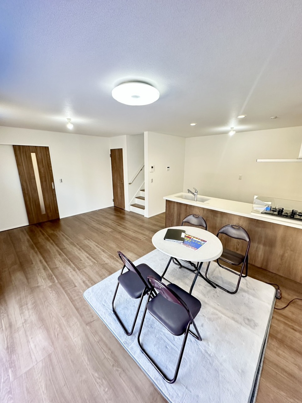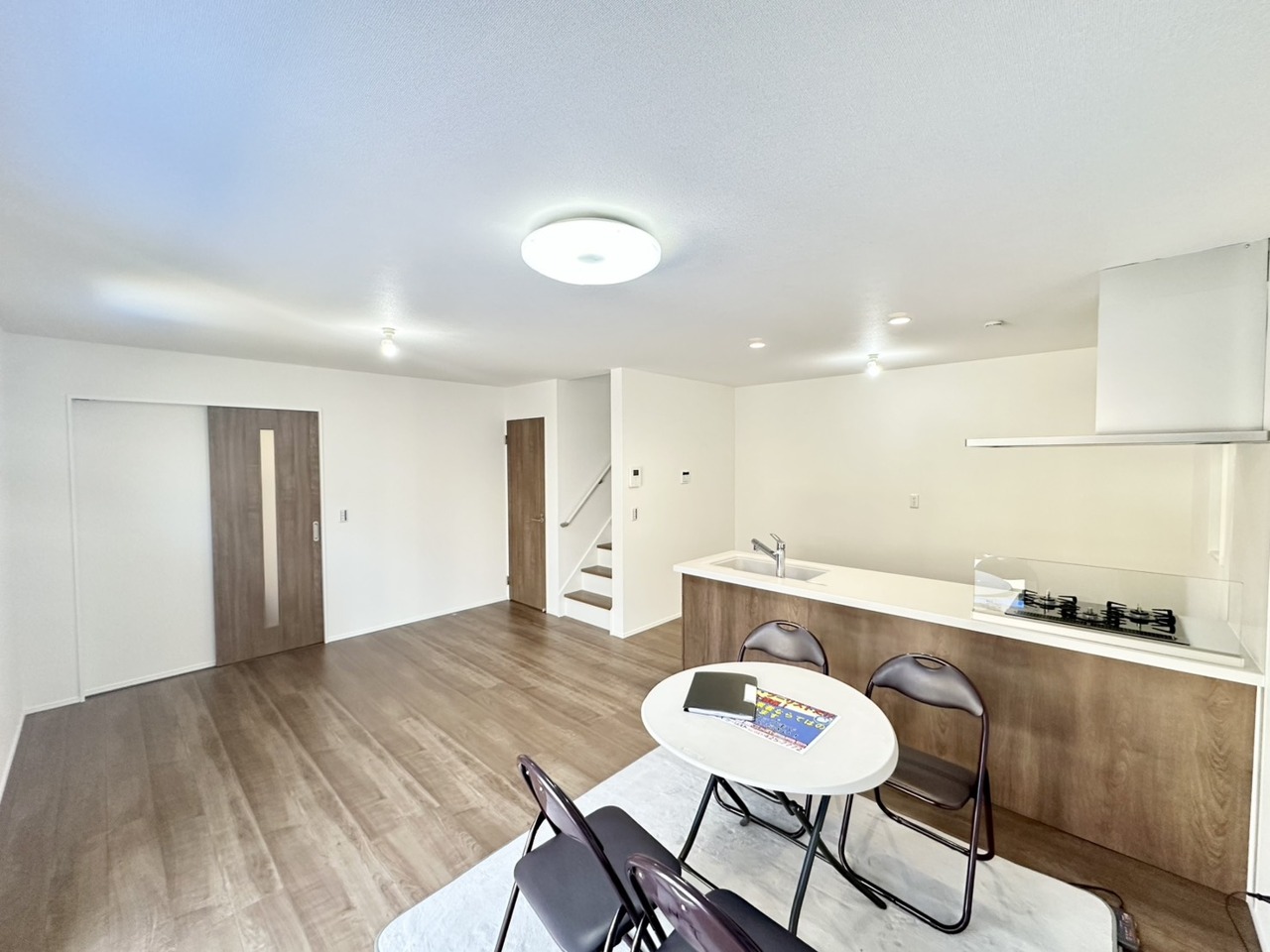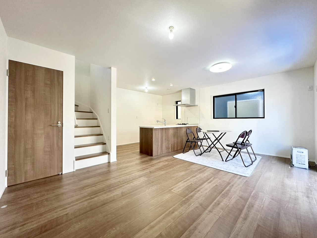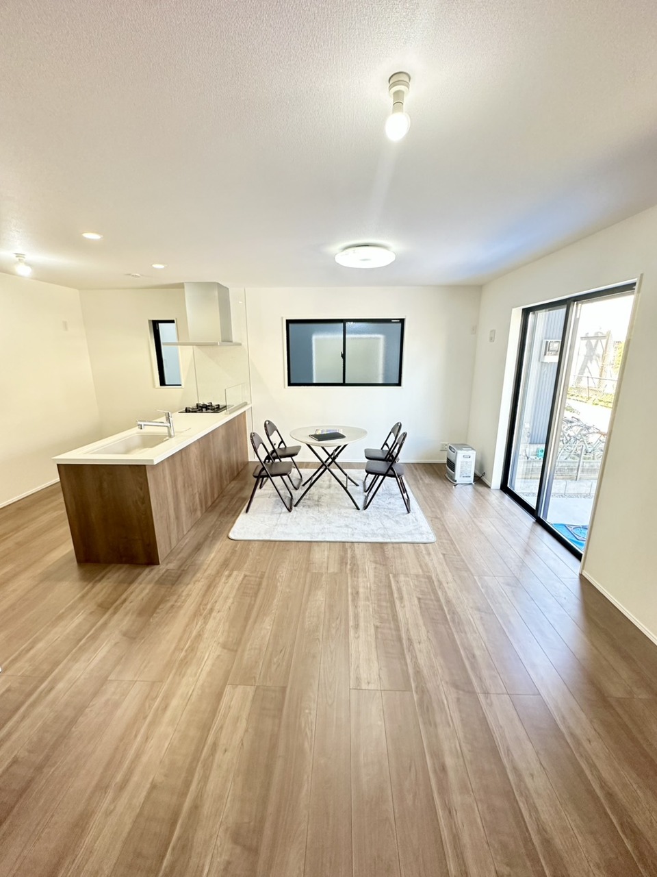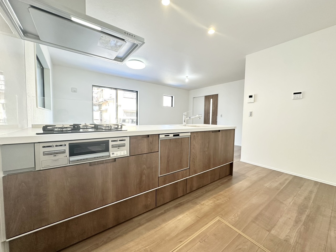 木の温もりを感じる床材と、柔らかな光が広がる空間。使い勝手の良いキッチンを中心に、家族や友人との会話が弾む心地よい暮らしがここから始まります