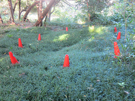 - 赤いコーンで囲まれた場所の下は竪穴式住居が発掘された場所。